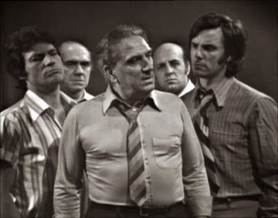 Por otra parte continuaban los ciclos de películas, las Novelas y el «Estudio 1», gracias al cual tuvimos la ocasión de descubrir extraordinarias obras literarias y teatrales a cargo de un extenso y valiosísimo plantel de actores y actrices, que no me resisto a recordar: entre los primeros José Bodalo, Fernando Delgado, Pablo Sanz, Jesús Puente, Jaime Blanch, Fernando Guillén, Manuel Galiana, Luis Varela, Emilio Gutiérrez Caba, Tomás Blanco, José María Prada, Andrés Mejuto, Víctor Valverde, Agustín González, Juan Diego, Álvaro de Luna, Estanis González, José María Caffarel, Ismael Merlo, Paco Valladares, Alfonso del Real, Manuel Alexandre, Manuel Tejada, Luis Prendes, Sancho Gracia, Manuel Dicenta, Manuel Gallardo, Valeriano Andrés, Pedro Osinaga, Pastor Serrador, Juanito Navarro, José Manuel Cervino, Francisco Morán, Julián Mateos, Nicolás Dueñas, Narciso Ibáñez Menta, José María Rodero, Carlos Larrañaga, Eusebio Poncela, José María Pou, Rafael Alonso, Juanjo Menéndez, Antonio Ferrandis, Alfonso Gallardo, Javier Escrivá, José Sacristán, Francisco Rabal, Manolo Gómez Bur, Alfredo Landa, Antonio Casal y José Sancho. Entre las actrices Luisa Sala, Ana Maria Vidal, Inma de Santis, María Luisa Merlo, Amparo Baró, Nuria Carresi, Tina Sáinz, Lola Herrera, Irene Gutiérrez Caba, Concha Cuetos, Gemma Cuervo, Mercedes Prendes, Marisa Paredes, María José Goyanes, Elisa Ramírez, María José Alfonso, María Silva, Aurora Redondo, Cándida Losada, Lola Lemos, Alicia Hermida, Fiorella Faltoyano, Mayrata O’Wisiedo, Charo López, Mari Carmen Prendes, María Luisa Ponte, Teresa Rabal, María Asquerino, Julia Martínez, Amparo Pamplona, Concha Velasco, Maruchi Fresno, Julieta Serrano, María Isbert, Mercedes Alonso, María Kosty, Carmen de la Maza, Marisol Ayuso, Mónica Randall, Victoria Vera, Maribel Martín, Emma Cohen, Verónica Forqué, Ana Mariscal, Silvia Tortosa, Rosa María Sardà, Ana Belén, Pilar Bardem, Emma Penella, y Julia Gutiérrez Caba. En la foto de la izquierda podemos contemplar a un buen puñado de estos (Bodalo, Osinaga, Merlo y Delgado, entre otros) en la obra «Doce hombres sin piedad».