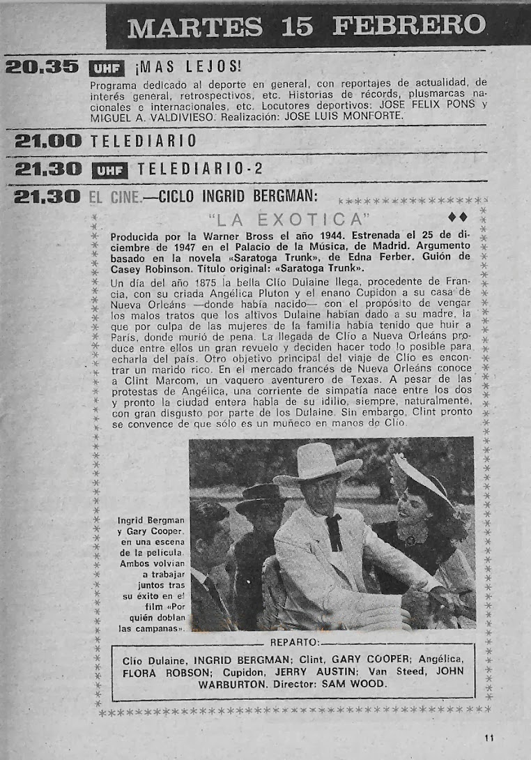El «Un dos tres» comenzó sus emisiones en abril de 1972 y fue uno de los programas de más éxito de la historia de la televisión, con sus secretarias minifalderas, Kiko y Don Cicuta (interpretado por el actor Valentín Tornos, fallecido en 1976 y que vemos en la foto de la izquierda acompañado de sus compañeros de programa), la voz de los supertacañones y la inefable Ruperta. Los domingos por la tarde echaban una serie de vaqueros (en aquellos años estaba muy en boga el genero del western), «Los dos pistoleros», (en 1973 llegaría «El Hombre del rifle» y en 1974 «La ley del revolver») y por la noche comenzaron los inolvidables «Estrenos TV» (quien no recuerda su famosa sintonía donde cada domingo nos presentaba un capitulo diferente de Colombo, McCloud, Banacek o Mac Millan y esposa. A «Marcus Welby, doctor en medicina» les seguirían en 1972 «Centro Medico» con el doctor Gannon interpretado por Chad Everett. Otras series de aquellos años serían las americanas «Cannon» (con el orondo William Conrad), «Hawai 5-0» y «Misión Imposible» o las españolas «Plinio» (con Antonio Casal) y «Aventuras y desventuras de Mateo» (con Jesús Puente). La Sesión de la Tarde del sábado se convertiría en «Primera Sesión» en junio de 1972 (cuya caratula adjunto). Recuerdo otra película de ese año y en ese espacio que también me cautivó y que me volvería cautivar veinte años después: la versión de 1940 de «El Ladrón de Bagdad», con Sabu y Conrad Veit. Inolvidable. En la UHF nació, ese año, el programa de entrevistas y actuaciones «Estudio abierto» de José María Iñigo que por entonces lucia unos enormes e inconfundibles bigotes y en 1973, concretamente el 28 de marzo comenzaba otro espacio histórico, por su duración en antena: «Informe Semanal», uno de los pocos espacios que aun continua en antena en la tele.
