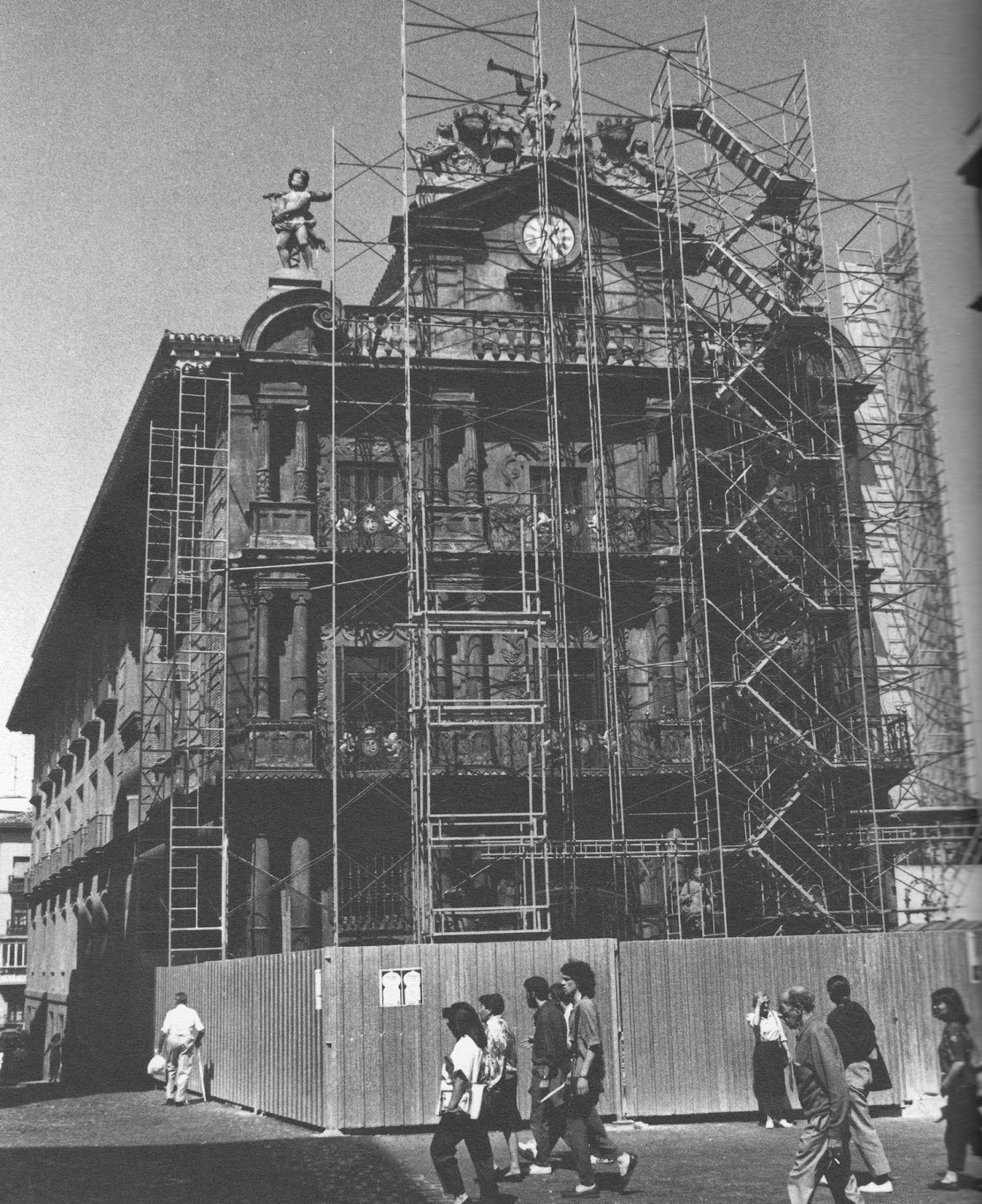El Ayuntamiento financiaba la producción de la zarzuela «La Bruja» de Chapí. Hacía 50 años que el Ayuntamiento no producía representaciones similares. El presupuesto superó los 8 millones de pesetas. Se presentó un proyecto para la ampliación de las instalaciones del complejo Larrabide. Finalizaron las obras de la torre de la Telefónica en Pamplona, con una altura de 68 metros. En los sanfermines del 90 se desmontaba la fuente de Navarrería para evitar la reciente tradición de los saltos de los «guiris». En Julio, el Ayuntamiento aprobaba un presupuesto extraordinario de 1.800 millones de pts para pavimentar las canaletas de los fosos de la Ciudadela, adecuar la Sala de Armas y realizar mejoras en el Oscus y el pasadizo de la Jacoba. Se aprobaba destinar 140 millones de pts a iluminar los 6 km de recinto amurallado. En verano se restauraba la fachada de la Casa Consistorial, tal y como vemos en la foto que acompaña este párrafo. El 30 de agosto se aprobaba el derribo de las escuelas de Compañía, que vemos en la fotografía, y que se produciría cuatro años más tarde,  lo que posibilitará la recuperación de la plaza y la construcción de un centro de salud. En septiembre y después de 10 años se retiraban las jaulas con animales (monos, cobayas, faisanes) de la Taconera.