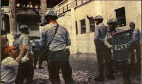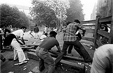 Es en este contexto en el que se desplegó al termino de la corrida del día 8 de julio una pancarta pidiendo la libertad de los presos que provocó algunos enfrentamientos verbales y también alguno físico. A continuación narro, con cierto detalle, los hechos que sucedieron a continuación, acompañando dicha narración de un amplio reportaje gráfico que sigue los hechos desde la entrada de la policía en la plaza hasta los enfrentamientos entre policías y manifestantes en las calles de Pamplona. A las nueve menos cuarto de la noche y aprovechando la entrada de las peñas txiki en el ruedo irrumpen en el coso taurino una cuarentena de policías antidisturbios, dirigidos por el comisario Rubio que comenzaron a disparar pelotas de goma y botes de humo contra los jóvenes que estaban en el ruedo así como contra los que estaban en las gradas. Al lanzamiento de objetos contra las fuerzas policiales estos respondieron con fuego real, produciéndose siete heridos de bala, del total de 55 que fueron atendidos en la enfermería de la plaza.