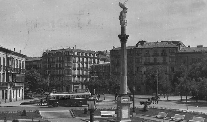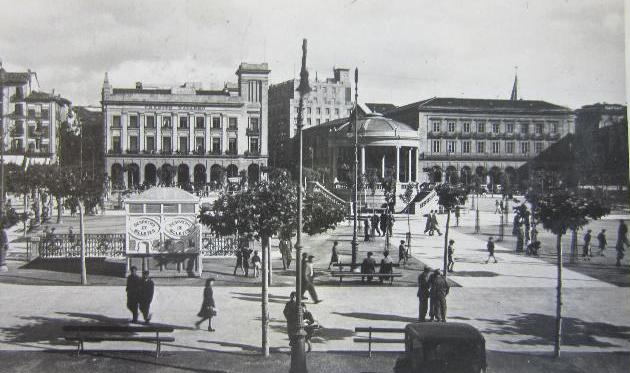 Por último les dejo cuatro instantáneas de la plaza del Castillo, tomada desde diferentes perspectivas y correspondientes al período 1950-1955. La primera, (foto inferior izquierda), tomada desde la zona de Casa Baleztena, es de 1950 y no muestra demasiados detalles interesantes, los bancos exteriores no eran los que hemos conocido más tarde, blancos sobre bases de cemento, sino algo más rusticos. El kiosko hacía tan solo siete años que se había inaugurado, concretamente en 1943. La segunda foto (foto inferior derecha) tomada desde la zona del pasadizo de la Jacoba es de 1952 y sí que nos ofrece algunos detalles interesantes: los coches de la época, algún cartel luminoso sobre los tejados como el de Osborne colocado sobre el edificio, donde años más tarde se radicaría la Cervecería Tropicana, las farolas que he comentado líneas atrás y que se asemejan al báculo de San Fermin y una bonita perspectiva de la avenida Carlos III, con el Monumento a los Caídos al fondo. La tercera fotografía, (foto superior izquierda) tomada desde la zona del Hotel La Perla, nos muestra una plaza del Castillo con el suelo mojado, en una tarde lluviosa y los detalles de la farola y el cartel mencionados anteriormente mucho más claros y evidentes, en este caso. Por último, en la cuarta fotografía, (foto superior derecha) tomada desde algún balcón del edificio del actual «alkartexe», vemos la plaza del Castillo, a la tarde con bastante animación de gente. Llama la atención la existencia de la taquilla para la venta de los espectáculos taurinos que estuvo en el lugar durante estos años.