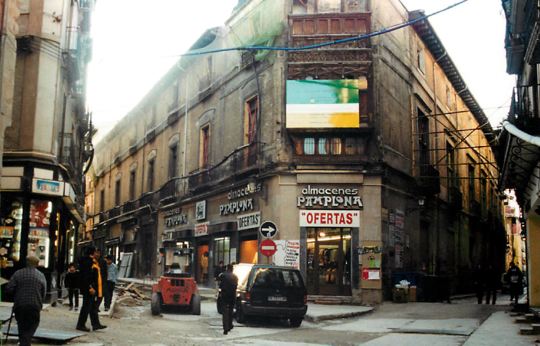 El 17 de enero, el Ministerio de Defensa vendía por 600 millones de pts al Ayuntamiento de Pamplona los derechos sobre el solar de intendencia. UPN, PSN Y CDN recalificaron el solar de dotacional a comercial, con más de 33.000 m2 teóricos, pues contando los m2 de parking al final fueron muchos más los construidos. En el se ubicaría El Corte Inglés. El Ayuntamiento compraba el Palacio del Condestable, que vemos en una foto más adelante, todavía con Almecenes Pamplona en funcionamiento, por 204,8 millones como sede del futuro centro cívico del Casco. El Gobierno proyectaba un parking de 1.300 plazas en la zona de hospitales. Se retomaba el tema de la nueva estación de Autobuses. Se debatía si ubicarla en Echavacoiz o en el centro de la ciudad. El Ayuntamiento ponía en marcha un registro municipal de parejas de hecho que entraba en funcionamiento en octubre. Dejaba de publicarse definitivamente el Bolétin de Información Municipal, el famoso BIM. Seguía enquistado el plan de construcción de viviendas en Iturrama Nuevo. El Ayuntamiento lo vinculaba a la urbanización de Trinitarios. El 2 de marzo el ayuntamiento llegaba a un acuerdo con el arzobispado por el que compraba la iglesia de Jesús y María en la calle Compañía. Se aprobaba el proyecto de rehabilitación del molino de Caparroso.