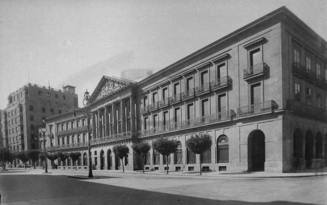 El primer edificio con el que nos encontramos en el comienzo en la avenida es nada menos que el Palacio de la Diputación Foral. El edificio se empezó a construir el 23 de diciembre de 1840, en el solar que ocupaba la huerta del convento de las Carmelitas Descalzas, y se hizo bajo proyecto del arquitecto José de Nagusia. Como curiosidad, cabe señalar que se utilizaron, en su construcción, piedras de las canteras de Ansoain y Ezkaba. Las obras estuvieron paralizadas entre 1843 y 1846 por falta de recursos. La primera sesión en el nuevo palacio se produjo en el año 1851. Hasta entonces la Diputación había desarrollado sus actividades en el palacio del Barón de Armendariz de la calle San Francisco y luego en la Casa de Antillón en la calle Estafeta. En 1965 se construyó un edificio de siete plantas de oficinas junto a los Jardines del Palacio, en la avenida San Ignacio, obra de Candido Ayestarán. A continuación de la fachada este del Palacio de Diputación,  nos encontrábamos con la sede central de la Caja de Ahorros de Navarra, inaugurada el 1 de enero de 1933 y que al igual que la fachada este del Palacio de Diputación (1932-1935) se realizó bajo la dirección de los hermanos Yarnoz Larrosa, si bien con una cierta inspiración «deco» sobre una base clasicista. Vemos con bastante claridad este edificio en la foto-postal en blanco y negro que encabeza esta entrada, datada en la segunda mitad de los años 50 y vemos junto a este párrafo dos bellas foto-postales, de los años 50, del Palacio de Diputación.
