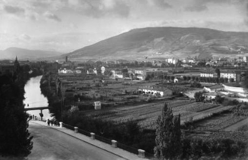 Nueva colección de fotografías de Ediciones Arribas y Luis Garcia Garrabella sobre Pamplona. En esta ocasión, les muestro unas bonitas panorámicas del barrio de la Rochapea, desde diferentes lugares de la Muralla y con diferentes perspectivas, todas ellas tomadas a lo largo de la primera mitad de la década de los 50. Empezaremos de oeste a este, por la perspectiva más occidental. En la primera fotografía se observa, con bastante nitidez, la recta de la avenida de Guipuzcoa, una avenida sin ningún vehículo circulando en ese momento. A la izquierda de la foto, lo que parece un transformador, por encima de él, la caja de la vía del Plazaola, que, como ya he recordado en otras ocasiones, en 1954 dejaría de funcionar. Junto a ella, parte de los edificios de una harinera y la estación de servicio de Discosa que por las diversas fotos de que dispongo, debió construirse a lo largo de la década de los 40. Los murales de la gasolinera, de Leocadio Muro, son precisamente de los años 50, de los años en que se tomaron estas fotografías. Pasada la Gasolinera estaba la fabrica de chocolates Orbea, inaugurada en 1952. A la nave que se vislumbraba desde el baluarte de Gonzaga, en la foto de Fidel Veramendi de 1920 (en la entrada referida al parque de la Taconera) se le unieron en décadas posteriores otras naves y construcciones. Tras de ellas el convento de las Oblatas, inaugurado en 1948 y al final, en el fondo de la foto, junto al puente de Santa Engracia, la fábrica Industrias del Caucho, erigida sobre la vieja Electra municipal. En la segunda fotografía, más virada hacia La Rocha, observamos la relativamente reciente plantación de arboles a la derecha de la avenida, el camino peatonal, por entre los arboles, a la altura del túnel subterraneo del Plazaola, por otra parte, tan familiar para mí, por las muchas veces que lo utilicé para subir a Pamplona y a su derecha, y si la comparamos con imagenes de décadas anteriores, unas cada vez más abigarradas construcciones en dos ejes claramente más desarrollados que el resto, uno en torno a la avenida de Marcelo Celayeta, con la torre de la iglesia del Salvador, descollando como un faro desde 1916, protagonista mudo de los muchos cambios que ha vivido el barrio y la ciudad desde entonces, y otro en torno a la calle Joaquín Beunza.