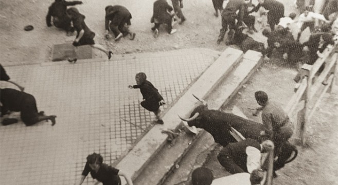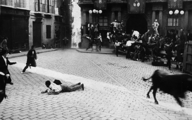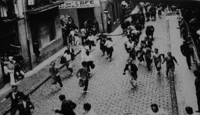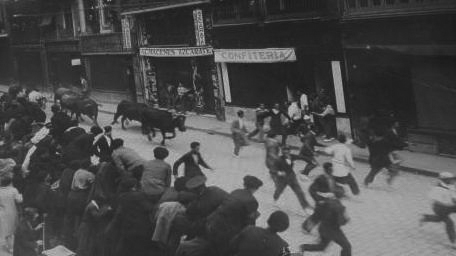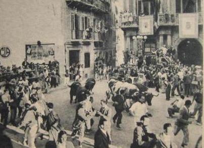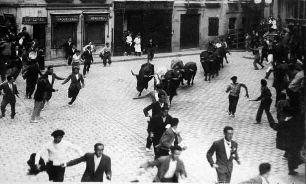 A la derecha del párrafo tenemos una foto de Ruperez de antes de la guerra del último tramo de Estafeta, donde descubrimos un cafetín que anunciaba desayunos en lo que luego sería el Bar Fitero. Seguimos viendo escasos corredores, vestidos mayoritariamente de calle. Unos días antes de estallar la guerra civil, el día 12 de julio, se corrían en Pamplona toros de Antonio Pérez de San Fernando. A este encierro corresponde la hermosa fotografía de los toros apareciendo desde la cuesta Santo Domingo a la plaza Consistorial, con dos toros resbalando y cayéndose y uno de ellos haciendo amago de empitonar a un mozo, mientras otros intentan subir, como pueden, por las fachadas de los edificios de ese lado de la plaza, para huir de los astados. Esta foto de Ruperez dió la vuelta al mundo al aparecer en la revista americana «Life». Los toros entraban hasta 1931 en la plaza consistorial y se perdían un tanto ante la amplitud del lugar, tras la estrechez del último tramo, de ahí que a partir de ese año se empieza a colocar otro vallado transversal para cortar la plaza y encaminar a toros y corredores hacia la calle Mercaderes.