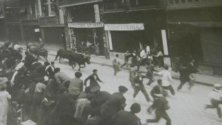 Las siguientes fotografías son todas de los años 30. En primer lugar, a derecha e izquierda de este párrafo, podemos ver sendas fotografías de Galle de la plaza consistorial, con todos los edificios que cerraban la plaza por el lado de la calle Nueva intactos, como se puede comprobar en la foto de la izquierda, y en la que un grupo de corredores, algunos perfectamente trajeados (una indumentaria nada aconsejable para correr el encierro) enfilan, hacia la calle Mercaderes; En la segunda foto (la de la derecha) de 1930-36, aparece un corredor caído en el suelo, tras el paso de un morlaco mientras otro aparece desde la cuesta de Santo Domingo.