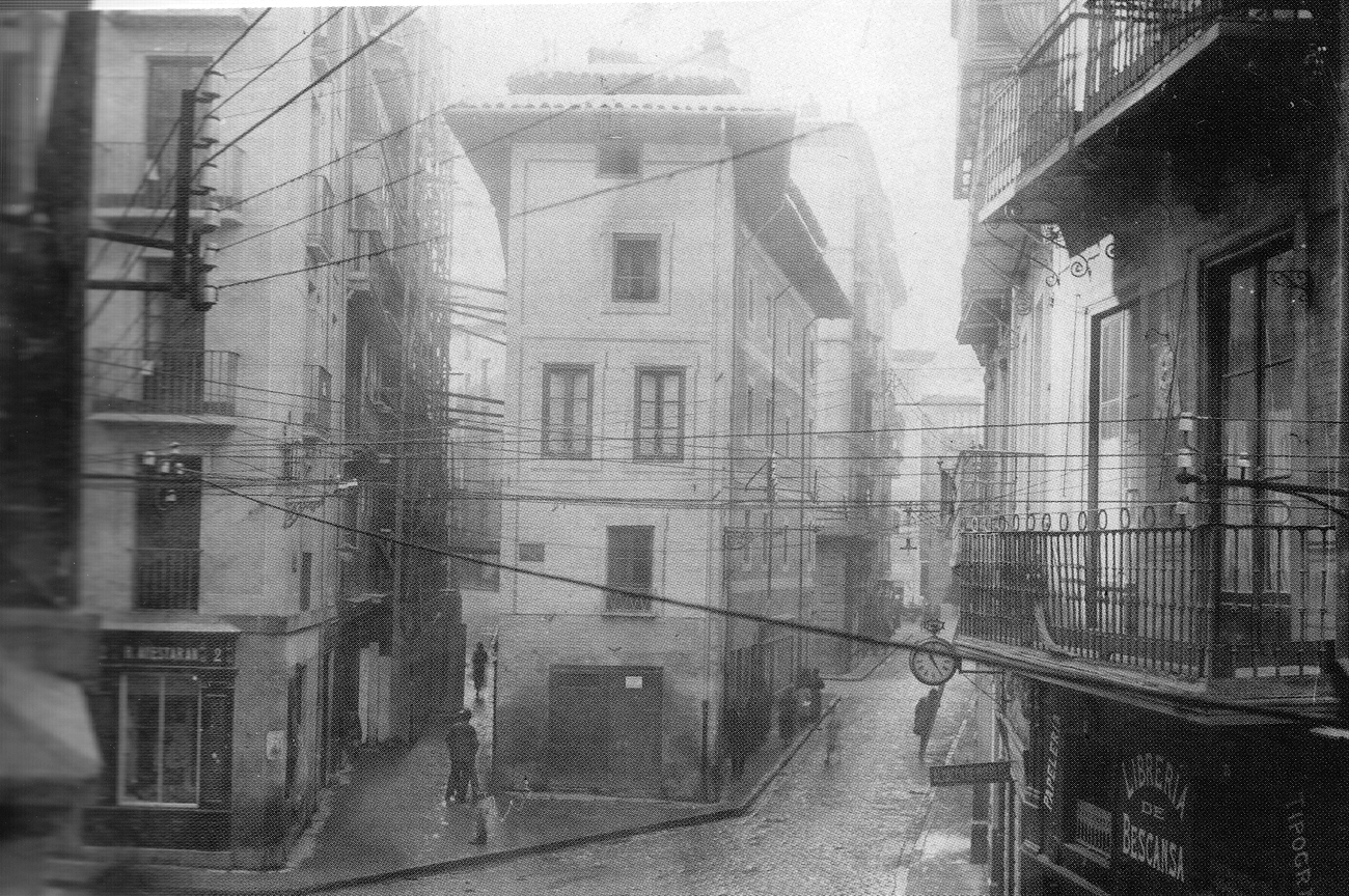 Dos imprentas tenían su sede en este lado de la calle, la de los Hermanos Lizaso, que además de ser imprenta vendía productos de papelería y objetos de escritorio y la de Teodoro Bescansa que vemos en el ángulo inferior derecho de la foto de la izquierda, de 1913, de Aquilino García Dean. La de los hermanos Lizaso sería durante muchas décadas, desde finales de los años 10 hasta final de siglo, la papelería de Castiella, de Hilario Castiella Banegas. Tras Castiella venían, y he aquí una curiosidad, la farmacia de los hermanos Ondarra que en los años 30 ya regentaba Joaquín Blasco y la tienda de Cleto Iriarte que vendía muebles y camas de hierro. En el local de Cleto Iriarte estuvieron más tarde, en los años 30, el bazar de Sucesores de Justo Gortari (vendían un montón de productos diferentes: juguetes, mercería, etc) y en los años 50 la joyería de Pio Bajo Ortiz, que tenía otra tienda en la avenida de San Ignacio. En su lugar estuvo luego Tejidos Condearena y la tienda de discos Liverpool. Tras el local de Cleto Iriarte estaba la citada imprenta de Teodoro Bescansa (luego Vda de Bescansa, Hijos de Bescansa y Regino Bescansa Santacruz) que vendía libros y productos de papelería. El negocio estuvo abierto hasta finales del pasado siglo. A continuación donde durante muchos años estuvo la tienda de calzado de Pedro Garamendi y luego de su hijo, Carlos y hoy la tienda Xaboiak hubo a primeros de siglo una tienda de ultramarinos cuyo titular se apellidaba Carracedo y a continuación una tienda de chorizos, tocinos, jamones y embutidos cuyo propietario se llamaba Eustaquio Martinez. Esta tienda pasaría a ser una tienda de comestibles después de la guerra (Martinez de Morentin) y posteriormente hasta finales de siglo una de las carnicerías Itarte.