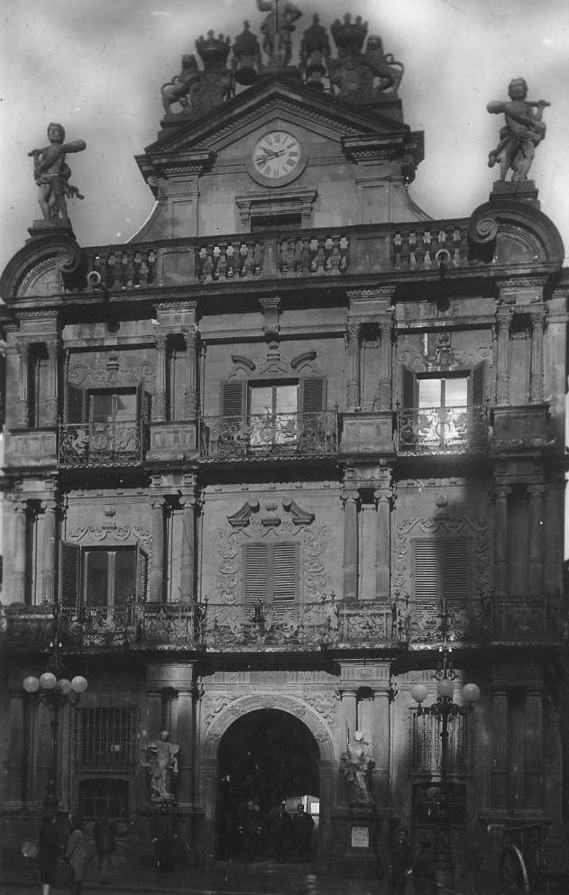 Voy a dar unas pinceladas, en esta entrada, de como era el Ayuntamiento de Pamplona en los años 20 y que servicios municipales había entonces en la ciudad. En 1921, era Alcalde de Pamplona, el jaimista José María Landa. Había en el Ayuntamiento nada menos que cinco grupos municipales, a saber 11 concejales jaimistas, que era una de las dos ramas entonces del carlismo, 8 nacionalistas (entonces solo existía en este ámbito el PNV), 2 mauristas, 1 republicano y 1 integrista (la otra rama del carlismo). Entre los jaimistas estaban nombres como el de Tomas Mata que también sería alcalde de Pamplona, muy poco tiempo después, y entre los nacionalistas estaban nombres como el del comerciante Ramón Unzu, el pintor Javier Ciga, el catedrático Leoncio Urabayen o el abogado Santiago Cunchillos. Junto a estas líneas podemos ver a la corporación municipal vestida de gala al comienzo de la década de los 30. El presupuesto municipal de 1922 se elevaba a 1.879.076 pesetas de las cuales 304.000 pesetas se destinaban al pago de sueldos de los empleados municipales, 213.000 a instrucción pública, 141.000 a beneficencia, 225.000 a obras públicas, 124.000 a policía de seguridad y 291.000 a policías urbana y rural.
