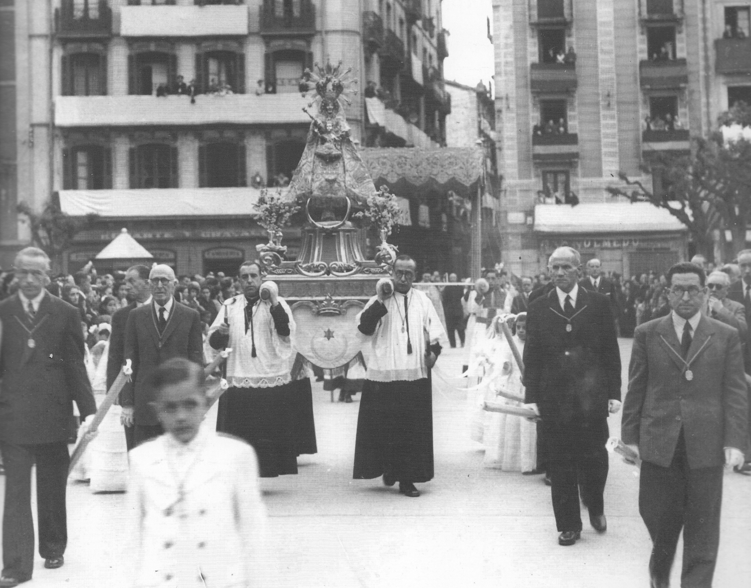 Como ya comenté en la entrada dedicada a la Pamplona de los años 40, buena parte de las manifestaciones de masas tantos políticas, culturales o festivas estaban teñidas o impregnadas por un profundo carácter religioso. Era frecuente la celebración en la calle de misas de campaña, procesiones, viáticos, homenajes y otros actos religiosos, y hasta un Congreso Eucarístico se celebró en Pamplona en 1946. La Navidad y especialmente la Semana Santa se vivía con otro carácter y sentimiento muy alejados de nuestros tiempos actuales. El calendario estaba lleno de eventos con un claro contenido religioso, de los que hoy en muchos casos apenas queda su vertiente de tradición cultural: la llegada del Angel de Aralar, San Blas, etc, y tenían gran predicamento las actividades de la Adoración Nocturna o de los Auroros de Santa María. En las fotos que ilustran esta entrada tenemos, en relación con este asunto y por orden de aparición: la procesión de San Saturnino de 1951, la llegada del Angel de Aralar a Navas de Tolosa de 1935, el Viático de San Nicolás de 1929 (es muy curiosa esta fotografía porque resulta que en aquel tiempo dicha procesión no recorría a pié toda la calle San Antón ya que en el nº 72 de la calle había vivido el republicano Basilio Lacort, el domicilio estaba excomulgado, y la figura religiosa hacia ese breve recorrido en coche, momento que recoge la foto), una procesión religiosa de 1917 pasando ante el Palacio de la Diputación y para finalizar, tras este párrafo, la procesión de San Fermín Chiquito, de 1948, por la calle Mañueta, la Octava de la Virgen del Camino, de 1950, a su paso por la plaza de San Francisco, y la procesión de San Blas de ese mismo año, a su paso por el mercado de roscos y tortas que se organiza el día 3 de febrero. Y aunque ya hablé de los orígenes católicos del movimiento obrero, no esta de más volver a recordar como la iglesia católica tuvo, en pleno franquismo, un grupo de laicos, organizados en torno al movimiento Acción Católica que progresivamente fueron tomando conciencia social y constituyeron, en algunos casos, el germen de buena parte de los movimientos políticos obreros de la Pamplona de los años 60 y 70, tal y como vimos en la entrada correspondiente de este blog.