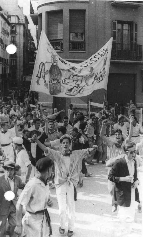 Como ya comenté en la anterior entrada dedicado a las sociedades deportivo recreativas, en 1940 nacía el Club Deportivo Oberena. El 20 de enero de 1941 se creaba la peña sanferminera, saliendo por primera vez a las calles el 7 de julio de ese año. Las fotos que acompañan este párrafo son de 1948, la de la derecha, al final de la calle Estafeta y de los años 50, la de la izquierda. Desde 1954 a 1987 el Labrit fue el lugar de encuentro o sede social de sus socios. Luego pasarían a su local social de Sebastian Albero, en la Milagrosa si bien hace unos años, en febrero de 2010, se hicieron con un local social en el nº 82 de la calle Jarauta y hace poco tiempo se trasladaron al nº 31 de la calle San Lorenzo, en lo que fue el antiguo restaurante Lanzale. Tras la creación de la peña se crearían también los grupos de danzas, txistu, gaita, rondalla y coros. La peña ha tenido siempre una especial vinculación con el mundo taurino. Visten indumentaria blanca y negra con la insignia verde que procedía del verde de Acción Católica. La peña Aldapa nació en 1947 como club deportivo, constituyéndose la peña en 1958. Tomaron el nombre del bar Aldapa en el que se reunieron al principio. En los años 80 se asentaron en el nº 48 de la calle Jarauta. Tampoco llevan blusón, solo el escudo bordado en el pañuelo.