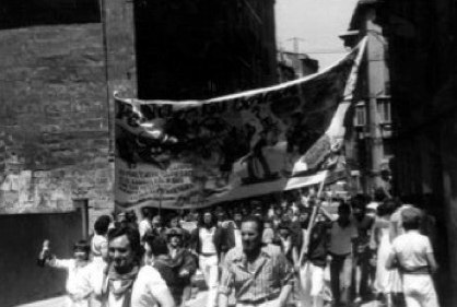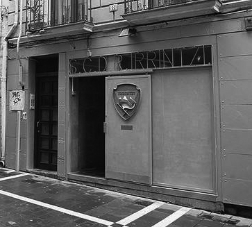 La peña Irrintzi de Iruña se fundó en 1950 de la fusión de dos clubes de fútbol, el Irrintzi y el Iruña. Desde el principio vistieron de negro. En 1953 se separaron el equipo de fútbol Iruña y la peña Irrintzi y se ubicaron en la calle San Agustín. En 1964 por falta de espacio, (y eso que tenían una bajera y dos pisos), se trasladaron al nº 23 de la calle Estafeta. Por problemas con los vecinos se tuvieron que trasladar al nº 8 de la calle del Carmen. El local incluía un bar que alquilaron para financiar la peña. Corría el año 1971. Pasaron de ser peña de club deportivo a sociedad cultural y deportiva. Además del fútbol la montaña era posiblemente una de sus actividades más destacables. En los años 90 reformaron el local que vemos en la fotografía. Visten blusón negro.La Peña Alegría de Iruña se fundó en 1952 en el Bar Moto Club por fusión de dos iniciativas juveniles, la peña Imoztarra, con sede en la calle Nueva, fundada en 1947, y el equipo de fútbol Alegría que se reunía en el Bar Arrizabalaga de la calle San Agustín, si bien sus primeros sanfermines como peña fueron los del 53. Me comenta Charo Iglesias que sus padres alquilaron el bar Alegría ubicado en el nº 22 de la calle San Agustín en julio o agosto de 1956 y que durante un tiempo compartieron espacio con la Peña Alegría. Tenían su oficina dentro del comedor de dentro. En algun momento, no recuerda las fechas, pero sería probablemente en los primeros años 60 la peña se trasladó a la calle Calderería. En 1969 tomaron el nombre definitivo de Peña Alegría de Iruña. En 1973 se inauguró un nuevo local en el nº 8 de la calle Jarauta y tras un atentado con bomba, el 19 de julio de 1978 se trasladaron al nº 61 de la misma calle, donde permanecen actualmente. Su actividad aparte de la sanferminera era fundamentalmente deportiva: salidas al monte, baloncesto, citas gastronómicas, cursos de cocina, danzas. Desde 1960 impulsan la Operación Patata destinada al asilo de las Hermanitas de los Pobres. Visten blusón verde con cuello, puños y bolsillos rojos. El pañuelo rojo con el escudo bordado y rematado a lo largo del borde con una cinta verde.