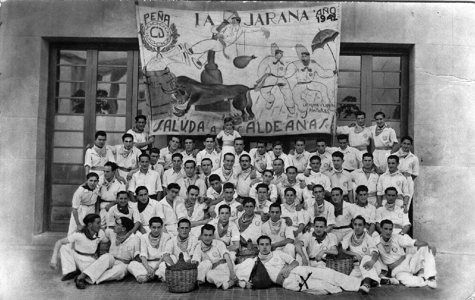 La Jarana fue fundada oficialmente en 1940 por varias cuadrillas de pamplonicas de la calle del Carmen. Ya desde estos años salían a la calle por Sanfermin con música y pancarta ocupando su espacio en el tendido del coso pamplonés. En la foto de la izquierda vemos una foto de la peña de 1942. La otra foto, la de la derecha, de Inge Morah recoge una salida de la peña, probablemente de los años cincuenta, tal vez 1954. Otras fuentes sitúan como antecesora de La Jarana a la Peña El Huevo aunque existen documentos gráficos de 1931 donde aparece una pancarta que dice «La Jarana saluda a Torón», un diestro navarro de la época. Su primera sede estuvo en la calle San Fermín en el Ensanche, para pasar más tarde a la calle Estafeta, trasladándose en 1982 al nº 16 de la calle Jarauta. Contaban con una sección de fútbol. Llevan pañuelo y faja azul con blusón a cuadros pequeños azules y blancos.