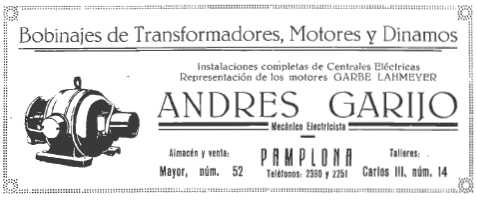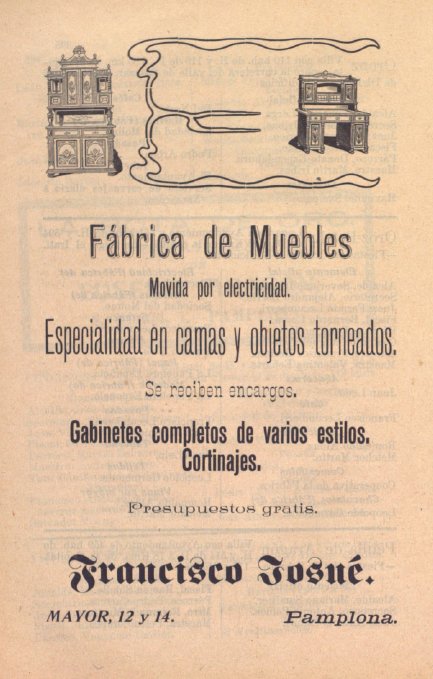 Luego venía la tienda de Ramón Unzu Got, Sucesores de Ramón Cia, bueno eso en los años 20, porque a principios de siglo los Herederos de Ramón Cia estaban en el nº 28 de la calle, no en el 20 (en el 6 con la nueva numeración en los años 50). Inicialmente la tienda era zapatería, alpargatería, cordelería, guarnicionería, vendía loza y vajilla ordinaria. Sus sucesores continuaron con los mismos productos aunque era más apropiadamente un bazar. En el 26 encontramos en los años 20 la ebanistería, sillería y tapicería de Mariano Gastón. A continuación la tienda de aparatos radioeléctricos de Víctor Bregaña (radiotelefonía, electrónica de automoviles, neveras industriales y objetos eléctricos en general) que en los años 50 ocupaba el nº 8. Junto a él en los años 50 estaba la Industrial Ferretera. Desde los años 40 aquí estaba la librería de Antonio Leoz y a continuación la Tintorería Paris de Marcelo Deslandes. En esta zona estaba también la prestigiosa Casa Azagra, de Pedro Azagra que también tenía otro establecimiento en Zapatería, 26. (En el local que tenía en la calle Mayor hubo antes una tienda de guantes y pieles, la de Luis Leache). Aparecía como ultramarinos al detalle, aunque también vendía embutido fabricados por ellos. Conoció en la calle Mayor diferentes ubicaciones, primero en el 34, luego en el 30 y posteriormente en los años 50 en el nº 21, donde hoy en día está Clase Moda. Junto a Casa Azagra estaba la tienda de pastas para sopa de Isabel Legarrea, la zapatería de José María Aizcorbe y la tienda de frutas y verduras de Valentin Val. En los años 50 encontrabamos en este tramo la mercería Ferran que cogía también puntos a las medias. A continuación estaba la fundición de hierro y acero de Martín Sancena, (cuñado de Salvador Pinaquy), uno de los fundadores de la empresa) que fabricaba también material agrícola, junto a su ferretería al por menor, ubicada en la calle Mayor desde 1890. En 1936 trasladaría parte de sus instalaciones a La Rochapea, concretamente los talleres de fundición, permaneciendo los talleres mecánicos y las oficinas en esta calle. Esta empresa era heredera de la sociedad Salvador Pinaquy y Compañía, fundada en 1850, que comenzó siendo un negocio de ferrería, fundición y construcción de máquinas, sobre todo agrícolas, afincada inicialmente en el Molino de Caparroso para irse dedicando, a partir de 1924 a la fabricación de elementos de mobiliario urbano y saneamiento. En este tramo de calle hubo antes y después otras actividades: la hojalatería de Fermín Tellería, la tintorería de Ramon Coyné que luego regentaría Pedro Arques. Y sobre todo donde estaba Sancena hasta 1968, (fecha en la que se traslada por completo a la Rocha), se instaló poco después Muebles Apesteguía.