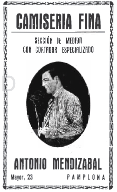 Dada la extensión de la entrada, la dividiré en dos partes, correspondiendo cada parte a cada una de las mitades de la calle. Si nos situásemos, de pronto, en el año 1908 cerca del pozo de San Cernin y mirásemos hacia San Lorenzo nos encontraríamos a la izquierda con los siguientes establecimientos. En primer lugar la tienda de tejidos de Bonifacio Ortega, -entonces Ortega y del Valle-, que aun continua abierta después de 116 años; la droguería y tienda de papeles pintados de Pedro Zabalegui,-hoy esta ahí la droguería de Pedro Pomares-; la mercería y paquetería de Miguel Aragues, que luego continuaría Manuel Lecumberri durante los años 20 y 30 al menos; la zapatería de Manuel García con calzado a la medida y la abacería de Mamerta Ibarrola que en los años 20 daría paso al establecimiento de Medina y Compañía, inicialmente con camisería y ropa blanca, si bien enseguida introduciría otros productos como guantes, perfumes y medias, como reza el anuncio adjunto, etc, y que hoy es la lencería Medina. Hasta no hace demasiado tiempo, -15 años o algo más-, ocupaba solo uno de los locales del portal nº 5, el último establecimiento que recuerdo abierto a su lado era la tienda de alimentación La Sevillana; en los años 50 estaba, junto a Medina, una zapatería de calzado fino, -así se les llamaba para diferenciarlo del calzado ordinario-, de María Luisa Urrutia, Viuda de Larreta.  A continuación venía la zapatería de José Llorente,  que vemos en la fotopostal de la derecha junto a este párrafo y que facilitó a este blog José Castells. El local fue reformado en 1924 por el célebre arquitecto Víctor Eusa y tras un corto período en que el negocio estuvo a nombre de Ramón Izco,  en los años 30, paso  de nuevo a la familia Llorente y más concretamente a manos de Paula. Luego venía la tienda de embutidos de Fermín Santesteban que luego cogería Tomás Villanueva, que posteriormente se trasladaría a otro local del segundo tramo de la calle, y que ocuparían en diversos momentos Bernardo y Venancio Villanueva que fundarían  la fabrica de Chorizos El Pamplonica y la de El Kiliki respectivamente, al final de la avenida de Zaragoza y en Burlada respectivamente; En los años 50 Venancio Villanueva aun mantenía esta tienda en la calle Mayor que en los 90 albergaría la tocinería Urdaniz.   Más adelante estaba la mercería y paquetería de Francisco Oyarzun, «El carrete» que luego abriría tienda en el Ensanche, aunque que yo sepa, hasta bien entrados los años 50, al menos,  mantendría la tienda de la calle Mayor, bajo la razón social de Oyarzun y Compañía. En el nº 15 de la calle había, a comienzos de siglo una imprenta, una de las muchas que ha tenido sede en esta rua pamplonesa. Pertenecía a Patrocinio Ramírez de Esparza. Posteriormente el local sería ocupado por una tienda de tejidos, o como se decía entonces una sastrería con surtido de géneros, especializada además en vestimenta militar, Zoilo de la Torre, de la que también dejo una fotografía, junto a este párrafo. El negocio continuaría al menos que yo sepa hasta la guerra, bajo la dirección de sus hijos. Tras ésta, en el nº 17 José García Catalán «Media Oreja» regentaba  La Zapatillera, que  vendía alpargatas, si bien el negocio es, al parecer, bastante más antiguo superando en la actualidad  el siglo de antiguedad. Desde principios de siglo su hermano Manuel había regentado la zapatería en el nº 5 y luego 7 de la calle. También en esa época en el nº 11 José Gil abría La Huerta Valenciana que vemos en una foto de los años 50 junto al siguiente párrafo, que me facilitó hace algún tiempo mi buena amiga Marcela Abarzuza.
