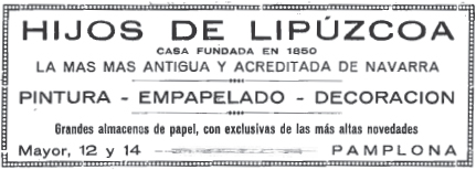 Volvamos a 1908. En el nº 4 estaban también la mercería de las hermanas Hernández  y tras la guerra la fabrica y tienda de Muebles Elosegui. Su propietaria era Esperanza de Miguel, Viuda de Elosegui. En las primeras décadas del siglo XX, en los números 6 y 8 estaban las ferreterías de Remigia Alzate y Joaquín Iturria así como el estanco de Ramón Gil, donde antes estuviese Manuel Lebrón; más adelante la carnicería de Corpus Arbizu, donde en en los años 30 estaba la zapatería Casa Briñol; la tienda de vinos de Patricio Taberna, y como he dicho la tienda de los hermanos Gorriz, luego de Pio Gorriz; el ebanista y tapicero Francisco Josué, luego Hijos de Josué que también vendían los muebles que fabricaba. A continuación la droguería Ardanaz, de Don Fructuoso Ardanaz que luego regentarían los hermanos Ardanaz y especialmente durante buena parte del siglo XX, Nicolás Ardanaz, el celebre fotógrafo. Como buena droguería, de las de antes, vendían de casi todo: todo tipo de productos químicos, abonos, pinturas, hasta cristales y como fotógrafo, incluso también aparatos fotográficos. No es el primer caso de droguero metido a fotógrafo o viceversa. Junto a la Droguería Ardanaz estaba la tienda de papeles pintados y pinturas, Hijos de Lipuzcoa que se mantuvo en el lugar, al menos hasta 1936.