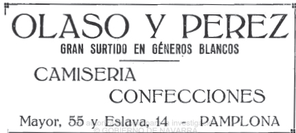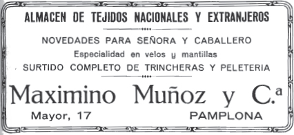 Dada la extensión de la entrada, la dividiré en dos partes, correspondiendo cada parte a cada una de las mitades de la calle. Si nos situásemos, de pronto, en el año 1908 cerca del pozo de San Cernin y mirásemos hacia San Lorenzo nos encontraríamos a la izquierda con los siguientes establecimientos. En primer lugar la tienda de tejidos de Bonifacio Ortega, -entonces Ortega y del Valle-, que aun continua abierta después de 116 años; la droguería y tienda de papeles pintados de Pedro Zabalegui,-hoy esta ahí la droguería de Pedro Pomares-; la mercería y paquetería de Miguel Aragues, que luego continuaría Manuel Lecumberri durante los años 20 y 30 al menos; la zapatería de Manuel García con calzado a la medida y la abacería de Mamerta Ibarrola que en los años 20 daría paso al establecimiento de Medina y Compañía, inicialmente con camisería y ropa blanca, si bien enseguida introduciría otros productos como guantes, perfumes y medias, como reza el anuncio adjunto, etc, y que hoy es la lencería Medina. Hasta no hace demasiado tiempo, -15 años o algo más-, ocupaba solo uno de los locales del portal nº 5, el último establecimiento que recuerdo abierto a su lado era la tienda de alimentación La Sevillana; en los años 50 estaba, junto a Medina, una zapatería de calzado fino, -así se les llamaba para diferenciarlo del calzado ordinario-, de María Luisa Urrutia, Viuda de Larreta. A continuación venía la zapatería de José Llorente, que vemos en la fotopostal de la derecha junto a este párrafo y que facilitó a este blog José Castells. El local fue reformado en 1924 por el célebre arquitecto Víctor Eusa y tras un corto período en que el negocio estuvo a nombre de Ramón Izco, en los años 30, paso de nuevo a la familia Llorente y más concretamente a manos de Paula. Luego venía la tienda de embutidos de Fermín Santesteban que luego cogería Tomás Villanueva, que posteriormente se trasladaría a otro local del segundo tramo de la calle, y que ocuparían en diversos momentos Bernardo y Venancio Villanueva que fundarían la fabrica de Chorizos El Pamplonica y la de El Kiliki respectivamente, al final de la avenida de Zaragoza y en Burlada respectivamente; En los años 50 Venancio Villanueva aun mantenía esta tienda en la calle Mayor que en los 90 albergaría la tocinería Urdaniz. Más adelante estaba la mercería y paquetería de Francisco Oyarzun, «El carrete» que luego abriría tienda en el Ensanche, aunque que yo sepa, hasta bien entrados los años 50, al menos, mantendría la tienda de la calle Mayor, bajo la razón social de Oyarzun y Compañía. En el nº 15 de la calle había, a comienzos de siglo una imprenta, una de las muchas que ha tenido sede en esta rua pamplonesa. Pertenecía a Patrocinio Ramírez de Esparza. Posteriormente el local sería ocupado por una tienda de tejidos, o como se decía entonces una sastrería con surtido de géneros, especializada además en vestimenta militar, Zoilo de la Torre, de la que también dejo una fotografía, junto a este párrafo. El negocio continuaría al menos que yo sepa hasta la guerra, bajo la dirección de sus hijos. Tras ésta, en el nº 17 José García Catalán «Media Oreja» regentaba La Zapatillera, que vendía alpargatas, si bien el negocio es, al parecer, bastante más antiguo superando en la actualidad el siglo de antiguedad. Desde principios de siglo su hermano Manuel había regentado la zapatería en el nº 5 y luego 7 de la calle. También en esa época en el nº 11 José Gil abría La Huerta Valenciana que vemos en una foto de los años 50 junto al siguiente párrafo, que me facilitó hace algún tiempo mi buena amiga Marcela Abarzuza.