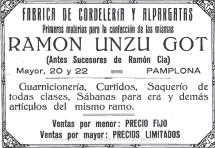Otra tienda de tejidos, la de Máximino Muñoz, había más adelante en los años 30, en el nº 17 (se inauguró el 11 de abril de 1924). A continuación una herrería, una tienda de muebles, de Sixto Fernández y una barbería (la de Eustasio Irujo), si bien en los años 20, en algunos de estos locales Elías Goñi montó una tienda de material eléctrico y Jose Armisén su celebre ferretería y en los años 30, Pedro Escudero abría también en uno de estos locales un bazar en el que se vendían, entre otros productos, juguetes que hacían las delicias de los niños. Posteriormente y en los años 30, encontrábamos la tienda de confección de Pedro Monasterio y la de camisería fina de Antonio Mendizabal. En los años 20, aparecía en el nº 25 un garaje de Florentino Murillo. Pero volvamos a comienzos de siglo. En esa época y a continuación, en el nº 27 Mauricio Guibert vendía artículos de electricidad, metales, vidrios, cocinas económicas, inodoros, etc. Posteriormente el local lo ocuparía la imprenta de Eduardo Albeniz que como la mayoría de las de aquella época era también papelería y librería, algunas incluso vendían objetos de escritorio y a partir de los años 30, Pascual Larumbe trasladaría su alpargatería desde el nº 44 a este lugar donde permaneció Casa Larumbe hasta su cierre hace unos algunos años. En realidad Larumbe fabricaba y vendía alpargatas como hacía Ramón Unzu Got (Sucesor de Cia) en esta misma calle. Más adelante encontramos en 1914 una mercería y paquetería que vendía también quincalla, osea bisutería, incluso más adelante vendió artículos de droguería, regentada por Daniel Zariquiegui, padre del famoso arbitro de fútbol y directivo de Osasuna, abuelo del actual titular, antes de que la tienda se especializara, con Daniel, en los años 50, en material deportivo. Anteriormente esta mercería estuvo regentada desde principios de siglo por Rafaela Aztarain. A continuación hubo varios negocios a lo largo del tiempo, una cestería en 1908 que posteriormente daría paso a la tienda de José Arrizabalaga (grabador, venta de armas, etc), la hojalatería de Gravalos, una tienda de velocípedos y accesorios y más tarde Confecciones Mendizabal. En los años 50 junto a Deportes Zariquiegui había una zapatería de género ordinario, de Joaquín Villanueva. Y cerca de la Zapatillera, en el 13, donde después estuvo las 3 BBB había una tienda de tejidos, de Justo Martinez y donde hoy esta Mei había otra tienda de tejidos, de Gregorio Olza.