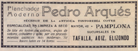 Luego venía la tienda de Ramón Unzu Got, Sucesores de Ramón Cia, bueno eso en los años 20, porque a principios de siglo los Herederos de Ramón Cia estaban en el nº 28 de la calle, no en el 20 (en el 6 con la nueva numeración en los años 50). Inicialmente la tienda era zapatería, alpargatería, cordelería, guarnicionería, vendía loza y vajilla ordinaria. Sus sucesores continuaron con los mismos productos aunque era más apropiadamente un bazar. En el 26 encontramos en los años 20 la ebanistería, sillería y tapicería de Mariano Gastón. A continuación la tienda de aparatos radioeléctricos de Víctor Bregaña (radiotelefonía, electrónica de automoviles, neveras industriales y objetos eléctricos en general) que en los años 50 ocupaba el nº 8. Junto a él en los años 50 estaba la Industrial Ferretera. Desde los años 40 aquí estaba la librería de Antonio Leoz y a continuación la Tintorería Paris de Marcelo Deslandes. En esta zona estaba también la prestigiosa Casa Azagra, de Pedro Azagra que también tenía otro establecimiento en Zapatería, 26. (En el local que tenía en la calle Mayor hubo antes una tienda de guantes y pieles, la de Luis Leache). Aparecía como ultramarinos al detalle, aunque también vendía embutido fabricados por ellos. Conoció en la calle Mayor diferentes ubicaciones, primero en el 34, luego en el 30 y posteriormente en los años 50 en el nº 21, donde hoy en día está Clase Moda. Junto a Casa Azagra estaba la tienda de pastas para sopa de Isabel Legarrea, la zapatería de José María Aizcorbe y la tienda de frutas y verduras de Valentin Val. En los años 50 encontrabamos en este tramo la mercería Ferran que cogía también puntos a las medias. A continuación estaba la fundición de hierro y acero de Martín Sancena, (cuñado de Salvador Pinaquy), uno de los fundadores de la empresa) que fabricaba también material agrícola, junto a su ferretería al por menor, ubicada en la calle Mayor desde 1890. En 1936 trasladaría parte de sus instalaciones a La Rochapea, concretamente los talleres de fundición, permaneciendo los talleres mecánicos y las oficinas en esta calle. Esta empresa era heredera de la sociedad Salvador Pinaquy y Compañía, fundada en 1850, que comenzó siendo un negocio de ferrería, fundición y construcción de máquinas, sobre todo agrícolas, afincada inicialmente en el Molino de Caparroso para irse dedicando, a partir de 1924 a la fabricación de elementos de mobiliario urbano y saneamiento. En este tramo de calle hubo antes y después otras actividades: la hojalatería de Fermín Tellería, la tintorería de Ramon Coyné que luego regentaría Pedro Arques. Y sobre todo donde estaba Sancena hasta 1968, (fecha en la que se traslada por completo a la Rocha), se instaló poco después Muebles Apesteguía.