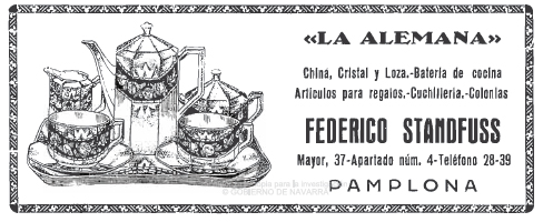 En el 35 de la calle Mayor había en 1908 una tienda que construía baúles y vendía o alquilaba muebles usados, negocio que cogería en los años 20 Inocencio Prieto. A continuación, Modesto Elizondo vendía vino por decalitros y en los años 20 y 30 Inés Prieto y Antonio Vazquez regentaron consecutivamente sendos negocios de muebles y Federico Standfuss, «La Alemana», una tienda de porcelana, loza y perfumería; José Sagues que era carpintero ofrecía los servicios durante las primeras décadas del siglo, asimismo, de una agencia funeraria, está claro porque, aunque en los años 50 parece que montó allí una tienda de comestibles; una tienda de molduras y marcos y en los años 30 estuvo también una tienda de productos eléctricos de los Hermanos Salanueva, y la ferretería de Enrique Sanz que con el cambio de numeración pasaría en los años 50 a ser del 45 al 35. Tras ella la hojalatería de Ramón Laforgue que estaba años atrás en el 53, 43, y pasó luego al 47. Pero volvamos un poquito hacia atrás; en los años 50 en los bajos del antiguo Centro Mariano estaban Muebles Apesteguía y una tienda de porcelana, loza y cristal de Pilar Carnicer. Tras la ferretería de Sanz, en los años 40 Petra Garcia Undiano abría donde antes estaba la tienda de saldos El 0,95 (el anuncio pertenece a otra ubicación anterior diferente en la misma calle) y anteriormente la hojalatería de Laforgue. A continuación venían la tienda de alimentación que en los años 20 regentaba Nicasio Echauri y que en los 50 cogería Demetrio Arbeloa, donde hoy está Joyería Berna, y que anteriormente a primeros de siglo albergó una tienda de alpargatas, costales y jergas, a continuación la mercería de Sucesores de Arocena yla tienda de antiguedades de Ignacio Eusa, la abacería de Manuel Zabalza (que en 1954, -año de la primera foto de la entrada-, regentaba Luis Ruiz y cuya apariencia permanece hoy exactamente igual que hace 62 años) y por último y para acabar este lado de la calle la tienda de venta de vino por decalitros de Miguel Anocibar en 1908, que fue imprenta de Argaiz en los años 20 y una tienda de tejidos, Olaso y Pérez en los 30. En los 50 había, sin embargo una zapatería, la de Benito Ruiz.