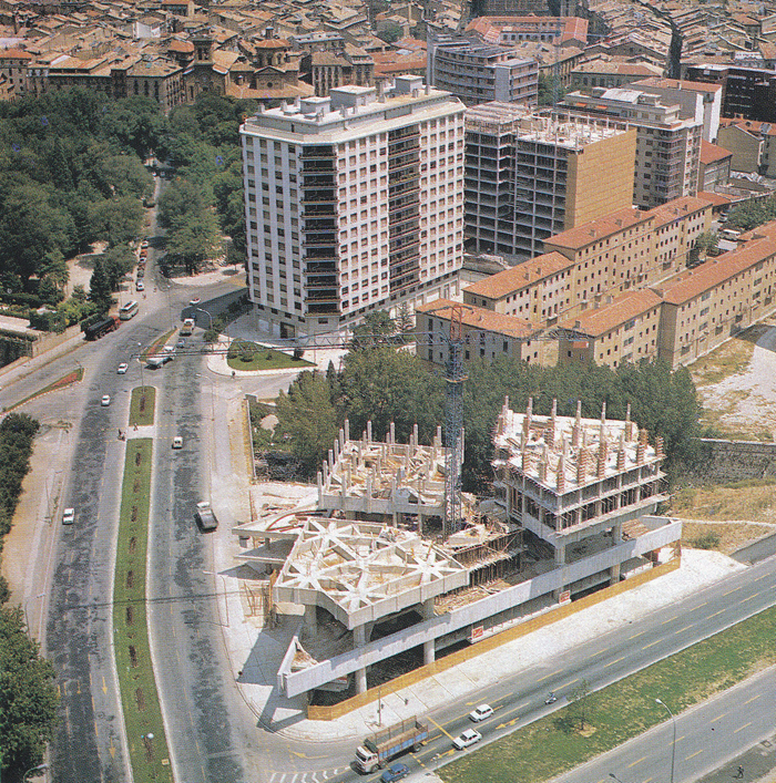 En dichas maquetas se incluían los grandes edificios de la Caja Municipal (construido entre 1975 y 1979) y el Edificio Singular (construido entre 1971 y 1976). En las fotos aéreas en color que ilustran el párrafo anterior de «Paisajes Españoles» podemos ver, en la primera, la avenida del Ejército en julio de 1973, con los solares totalmente expeditos, bueno aun podemos ver alguna barraca sanferminera en el solar de la izquierda y en la segunda las obras de construcción del Edificio Singular, detrás los pabellones militares situados entre las calles del Padre Moret y Patronato derruidos en junio de 1980.Pese a los proyectos previstos para estos espacios, en 1976, el Ayuntamiento aprobaba destinar los solares de los cuarteles a sendos aparcamientos que comenzaron a funcionar el 2 de julio. Como hemos visto en otras entradas de este blog el proyecto de construcción de la estación de autobuses se retomaría en 1986, con el encargo de un estudio y, posteriormente, en 1989, con la convocatoria de un concurso, ganando la del equipo que a la sazón acabaría diseñando la estación, con las modificaciones oportunas fruto de los condicionantes de Príncipe de Viana. Las obras de la estación se iniciaron en 2005 y finalizaron en 2007. En cuanto al Auditorio el proyecto se recuperó en 1997, empezando las obras en el año 2000 y finalizándose en el 2003. Y tras las idas y venidas municipales sobre la Audiencia, en los años 70, este asunto se encarrilaría finalmente en 1988 con el ofrecimiento municipal al Ministerio de Justicia de los antiguos terrenos del Matadero, mientras que en el viejo edificio del Paseo de Sarasate se instalaría el Parlamento de Navarra. En el solar de Intendencia se instalaría,por su parte, tras un segundo intento, -el primero fue en 1994-, El Corte Inglés, inaugurado en 2005. Así culminaba pues, el proceso de reordenación de los espacios antiguamente ocupados por los cuarteles militares.