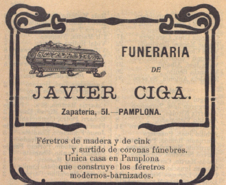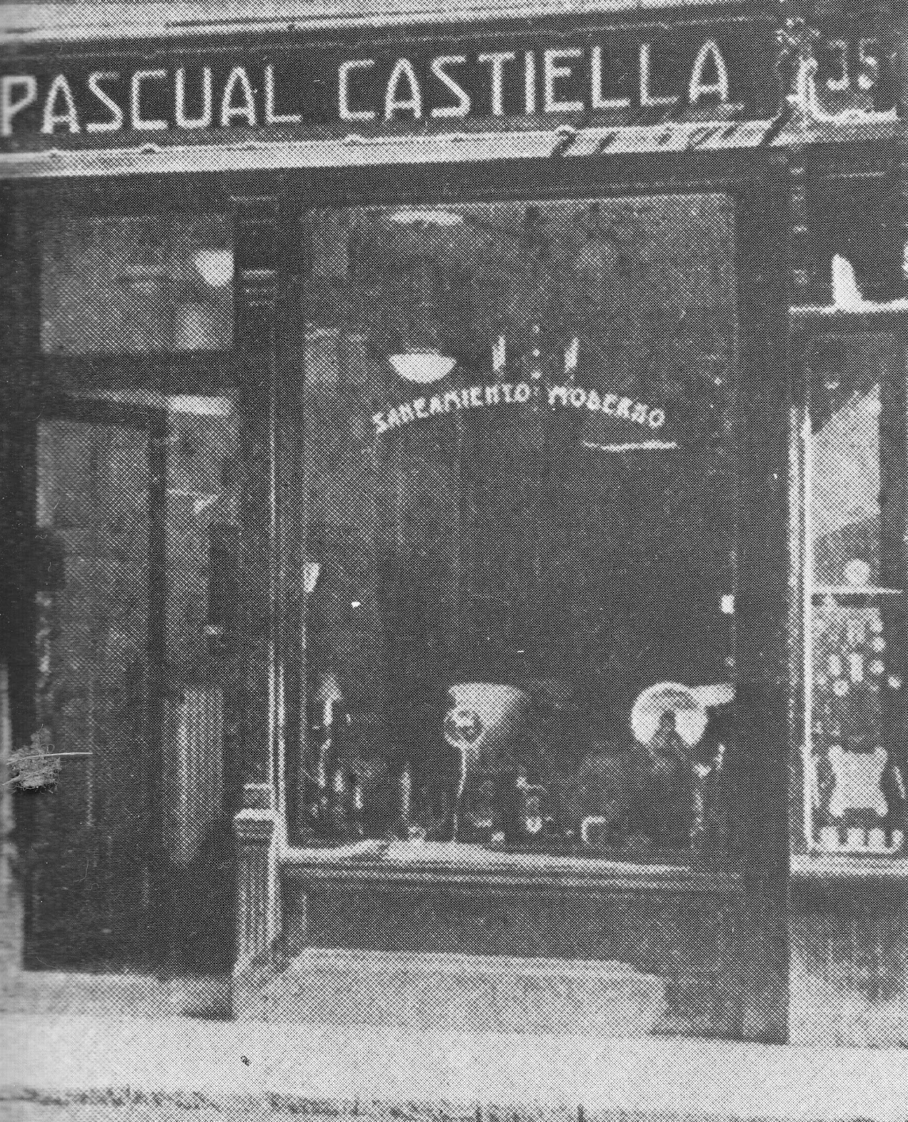 Pero continuemos, pasando el pozo de la Salinería, en la esquina con Pozoblanco, estaba Casa Aznarez, conocida por confeccionar y vender sombreros para caballero, además de otro tipo de género a lo largo de su dilatada historia, (cuando falleció Manuel, paso a regentarlo su viuda, Juana Sarasa); luego la farmacia de Justo Aguinaga, fundada en 1888 y que hoy regenta su bisnieto Roberto, la tienda de confección de Antonio Garrigosa conocida como La Gran Ciudad de Londres, donde hoy está Lencería Silvia y que vemos en la fotografía de los años 20 que acompaña al párrafo anterior; antes de Garrigosa estuvo en ese local Aroza y Gortari con mercería, paquetería y quincalla (bisutería), la carpintería de Juan Ortigosa que se traslada en los años 20 al local de al lado para montar una agencia funeraria, (no sería el primer ni el último carpintero que tomaría medidas para nuestro último viaje), de hecho en esta calle había dos funerarias, la de Ortigosa y la de Ciga. Esta última conoció varios emplazamientos, a primeros de siglo en el nº 51 y posteriormente en el 62 y en el 56), la imprenta de Nicolás Marcelino (también vendía papeles pintados), la hojalatería de Santos Ortigosa que vendía también quinques y lámparas. El local de Ortigosa lo cogería luego Pascual Castiella, cuya familia regentó el negocio desde los años 20 y por lo menos hasta los años 60, ubicándose en este período entre el 31 (en los años 20) y el 35 (en los años 50). Junto a él estuvo un tiempo la carnicería de Tomas Egaña que se trasladaría posteriormente a otro local de la calle. Del local de Castiella podemos ver una fotografía datada en 1919, junto al párrafo siguiente.