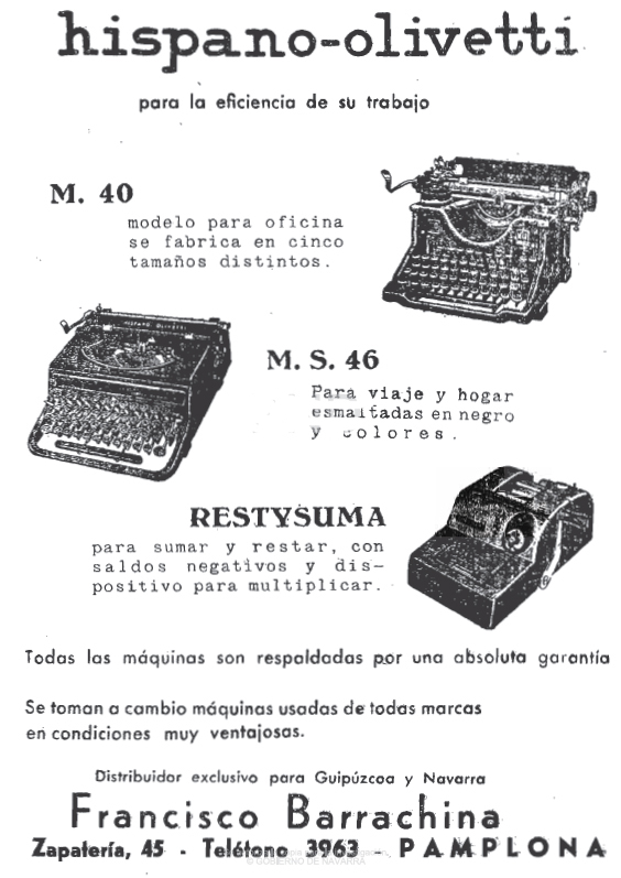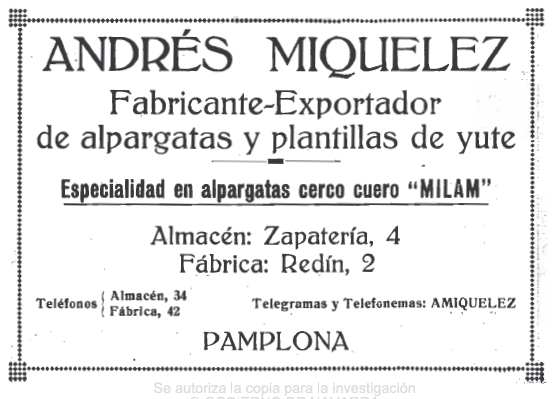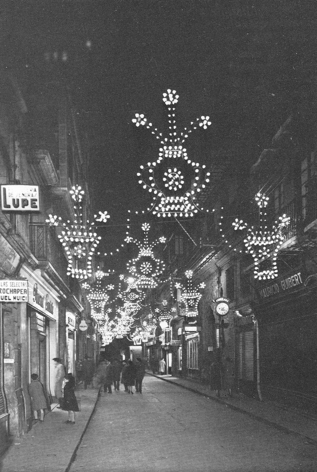 En efecto, como ya he adelantado, en 1941 se instalaron en el nuevo nº 43 de la calle Tejidos San Andrés, fundada por Primitivo Esquiroz Oricain y Confecciones Madrileñas; junto a ellos, algunos años más tarde, estaban en el nº 45 la Ferretería Purroy y la tienda de venta de máquinas de escribir de Francisco Barrachina y posteriormente, en el nº 47, donde sigue estando actualmente la fabrica de chocolate y cerería de Justo Donezar, fundada en 1853, que posteriormente regentaría su viuda, Vicenta Sarasibar y que hoy dirige su bisnieto Joaquín. A continuación, a principios de siglo estaba, como he dicho, la carpintería de Javier Ciga, que pasaría primero al 62, en los años 20 y luego al 56, en los años 30, y la fábrica de corte y calzado de German Anaut. En 1921, el Diario de Navarra trasladaba su sede social desde el nº 40 de la calle hasta este lugar, al nº 49. Acabamos nuestro repaso en el nº 51 con la alpargatería de Juan Garcia, luego Viuda de Juan García, presente en ese lugar, como ya he señalado anteriormente, desde finales de los años 20 hasta el año 2000. La última de las fotografías recoge una panorámica de la calle en las navidades de 1958, con las luces en altura y algunos comercios perfectamente distinguibles: a la izquierda, Huici, Pascual Castiella y Sagarra, a la derecha la tienda de muebles de Mauricio Guibert.