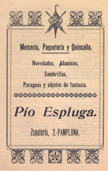Regreso a la serie de entradas del blog en las que reconstruyo la historia de las calles del Viejo Pamplona y de los comercios que la habitaron a lo largo de la primera mitad del siglo XX. En esta ocasión nos vamos a la calle Zapatería, calle principal de la Población de San Nicolás y uno de los ejes comerciales más importantes de lo Viejo. Calle de claras resonancias comerciales con establecimientos emblemáticos. A comienzos del siglo XX, allá por 1908, si nos situábamos al comienzo de la calle, muy cerca de la plaza del Ayuntamiento, nos encontraríamos, comenzando por la derecha con un número muy similar de establecimientos, apenas cuatro más que en la actualidad, y una estructura parcelaria muy similar a la actual, muchos pequeños establecimientos en el tramo estrecho de la calle, el más cercano a la plaza consistorial, y bastante más grandes en el siguiente tramo, el que va del pozo de la Salinería a la plaza del Consejo. En ocasiones citaré, como referencia, algún establecimiento actual u otro que haya sido muy conocido, a lo largo del tiempo, para situar a los lectores respecto de lo que sería su ubicación actual. A lo largo de esta entrada reproduzco algunas fotografías de esta calle, de diferentes épocas (datadas entre 1900 y 1958), como las que la encabezan, de primeros de siglo, así como un buen número de anuncios publicitarios de establecimientos de ella. Comienzo el repaso de sus establecimientos, sin más dilación.