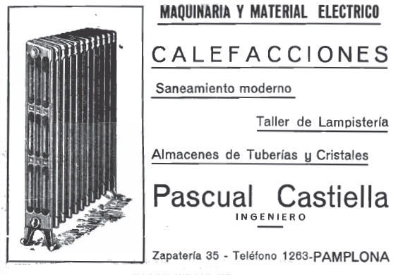 Inicialmente Pascual Castiella era hojalatería y lampistería, vendía aparatos de calefacción, cocinas económicas, cristales, material de electricidad, taller de fontanería, sanitarios, vendía y reparaba radios, etc. En el local contiguo, en el que ocupaba Santos Ortigosa se instaló desde finales de los años 20 Manuel Huici, que cerró su nieto hace un par de años. En el nº 35 estaba también y estuvo hasta hace unos pocos años Sagarra o más apropiadamente Herederos de José Sagarra, fundada en 1878 que vendía artículos de cristal, loza y porcelana, luego la imprenta de Goyeneche, (que vendía también libros nuevos) y la tienda de ultramarinos de Félix Marrodán. Tras Castiella y Sagarra, en los años 20, ocupaba los números 37 al 41 Mauricio Guibert (donde hoy está el local cerrado desde hace ya casi una década de Euskal Piel). Vendía de casi todo: era almacenista de hierros y aceros, taller de lampistería, fabricaba cajas de caudales, cristales, objetos eléctricos, estufas, quincalla, trenzas para alpargatas, muebles, etc, la familia vivía en el mismo edificio. En los años 50 aparecía registrado como bazar, bisutería y quincallería. A continuación de Mauricio Guibert había en los años 20 una hojalatería y lampistería, Arteaga y Erroz. El edificio que alojaba este negocio y que vemos en la fotografía de los años 30, junto a este mismo párrafo, sería derruido y con él se perdería cualquier vestigio de la casa, que se dice habitó San Francisco Javier, construyéndose, tras la guerra, un nuevo edificio, el actual nº 43 en el que tienen su sede Tejidos San Andrés y Confecciones Madrileñas.