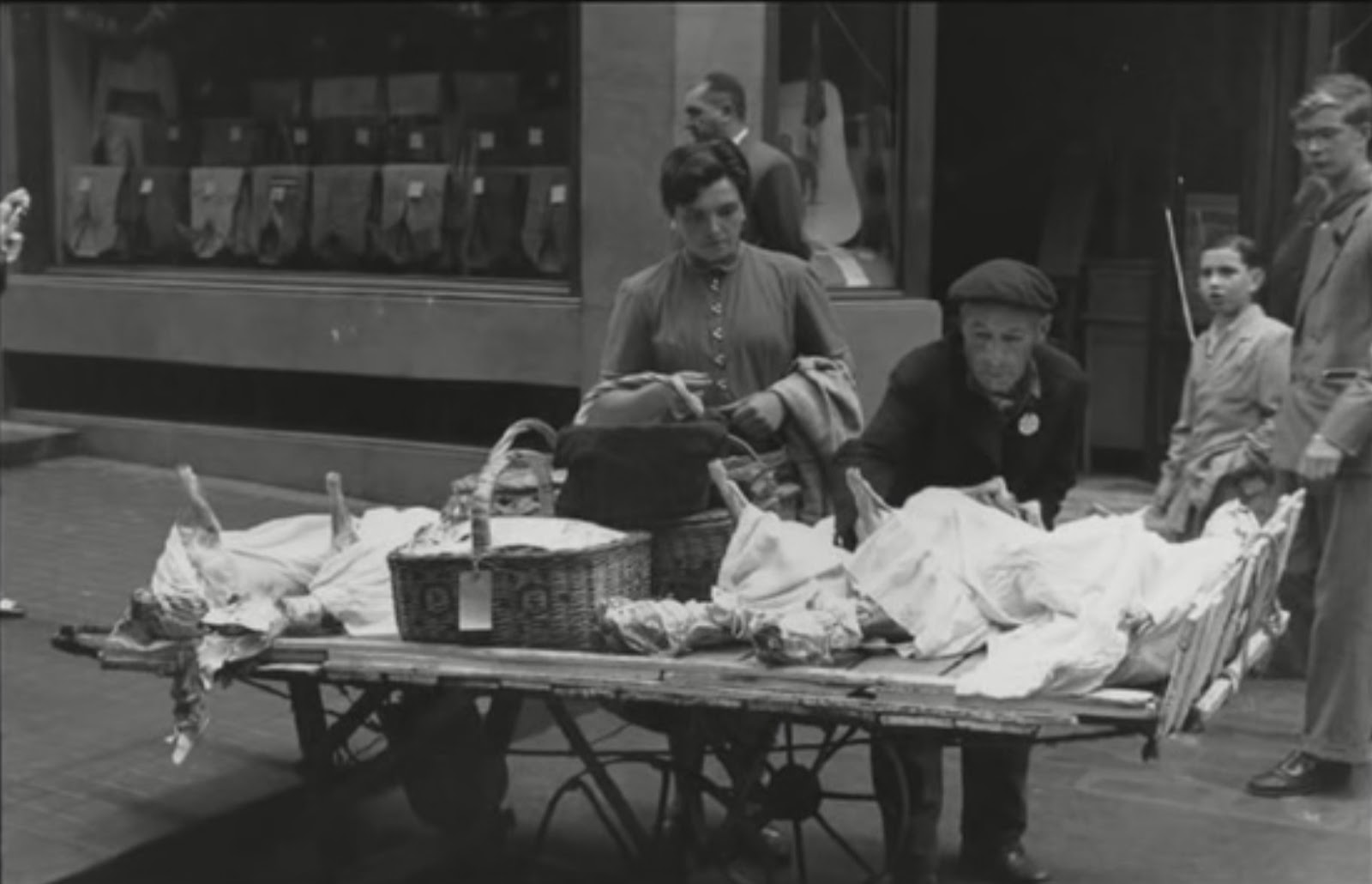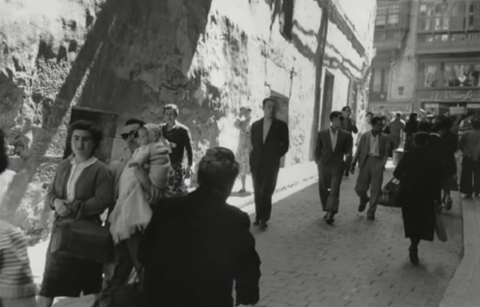 Aun quedaban en 1954 muchísimos retazos de aquella vieja ciudad en la que te cruzabas cada dos por tres con una monja o un militar, como en la primera foto de esta entrada y como ya hemos visto en este blog, con el paisano trasladando un ternero al hombro, en la esquina de Ortega, al principio de la calle Mayor, pero donde también te encontrabas con otro paisanaje lleno de autenticidad y sabor, pues por ejemplo no era inusual ver a algún «aldeano» acarreando su carrico, con su fresco producto cárnico, parado en mitad de la calle, como vemos en la segunda fotografía, concretamente en las escalerillas que bajan de la plaza del Castillo a San Nicolás, enfrente de la sastrería y camisería Palomeque (sí donde hoy está el Dom Lluis), o vendedores ambulantes como el que vemos en la tercera fotografía, -creo que es la calle San Saturnino-, con la Casa Hualde al fondo, que suscita la atención de un nutrido grupo de estudiantes de algún colegio religioso. En la última fotografía podemos disfrutar de una animada calle Mañueta, gente subiendo y bajando imaginamos que al Mercado de Santo Domingo con los comercios Droguería Ardanaz y El Triunfo, de la calle Mercaderes, al fondo.