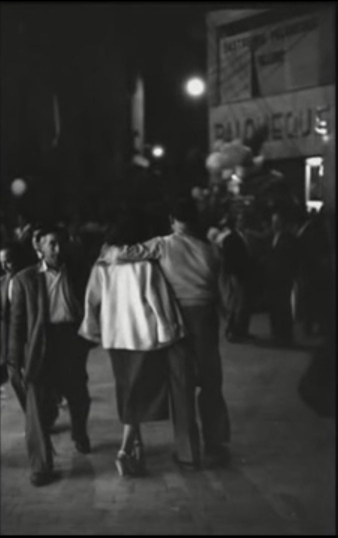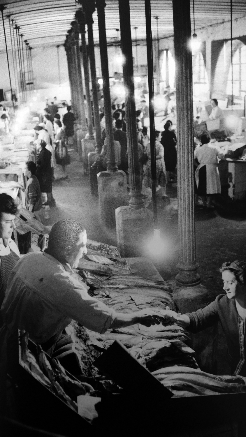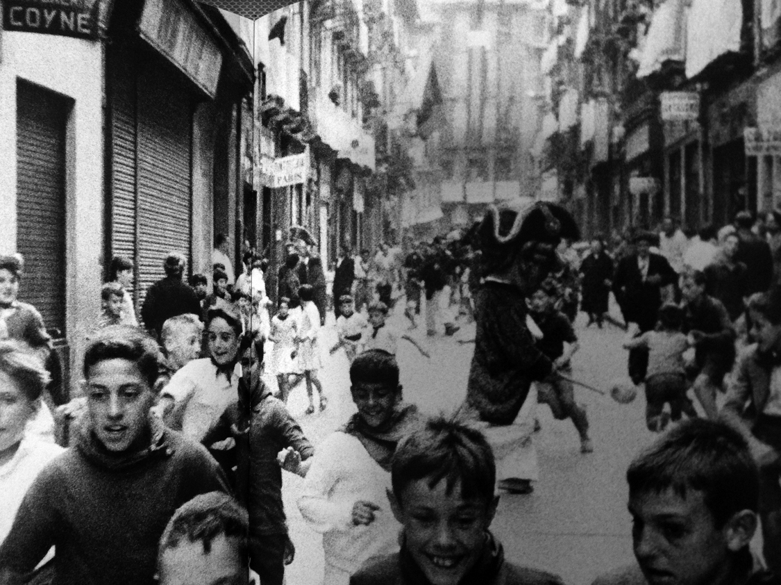 Las dos primeras fotografías de esta segunda fila de fotos son, también, de Inge Morath, la primera retrata el ambiente callejero nocturno sanferminero en el cruce de San Nicolás con Pozoblanco y Comedias. Volvemos a ver la sastrería Palomeque, de Martin Palomeque. De hecho la familia que abrió el Dom Lluis, fueron comerciantes antes que hosteleros y llegaron a tener también otra tienda textil en la calle Comedias, Marpa (abreviatura de Martin Palomeque). La segunda fotografía nos sitúa, en una luminosa mañana sanferminera, en la trasera del ayuntamiento, junto al Mercado, mirando hacia la antigua Bajada de Carnicerías, donde podemos ver como ya se han derribado algunos edificios, con el fin de construir poco tiempo después la nueva plaza de los Burgos. De nuevo el carrico, esta vez cargado de gallinas prestas a ser vendidas en la «Plaza», como decía mi madre, plaza o mercado viejo, cuyo interior y ambiente, -así era el Mercado hasta 1986, sus columnas de hierro, aquellas luces colgando-, podemos ver en la foto de Ramón Massats. Acabamos esta pequeña selección fotográfica con dos fotos de ambiente sanferminero de este mismo autor catalán, la primera de la calle Chapitela, con la farmacia Boza y la ferretería Campion al fondo, la segunda de la chiquillería corriendo ante los cabezudos en plena calle Mayor, se divisa a la izquierda el letrero de la tintorería Coyné que descubrimos al hablar de los comercios de la calle Mayor. En los próximos meses abriré nuevas secciones en el blog e introduciré algunas mejoras. Espero que les guste.