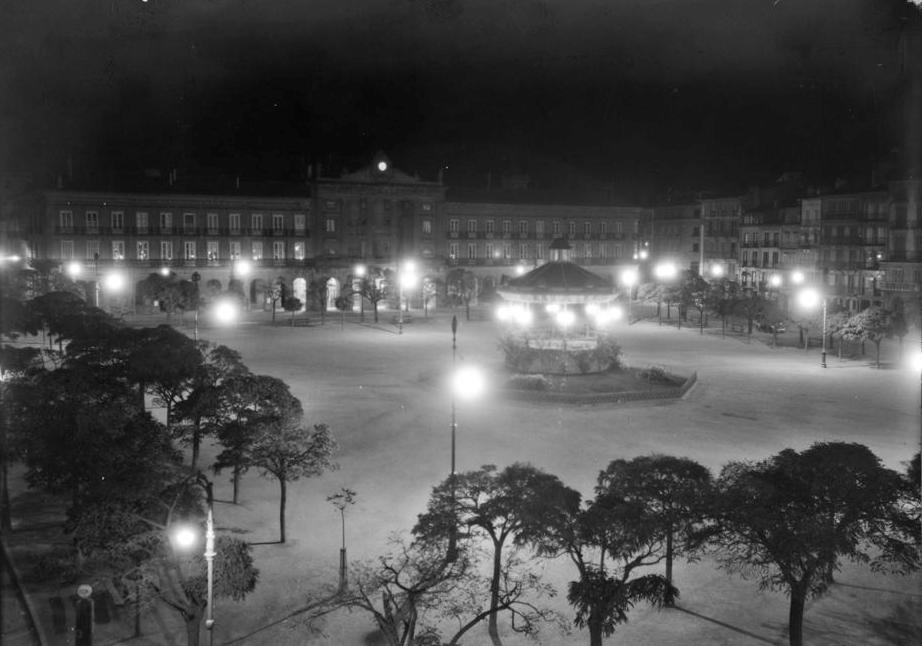Como curiosidad, si se fijan en las farolas, se darán cuenta de que al menos se ha recuperado el estilo de las luminarias, pues dichas farolas tipo báculo son las que actualmente lucen en la plaza. Para datar la fecha de realización de las fotos, me he basado en dos hechos que nos pueden acotar algo la cronología. Vemos que ya está construido el nuevo edificio del Banco de España en el Paseo de Sarasate (se terminó en agosto de 1927) y aun no se ha derribado el edificio del Teatro para trasladarlo a su actual ubicación en la avenida de Carlos III (se derribó en 1932), por lo tanto la fotografía tiene que ser forzosamente de ese período.