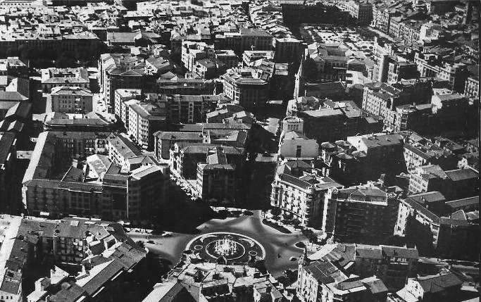 que se ve el Monumento a los caídos, abajo a la izquierda, se ve el edificio del «Hogar Santa María la Real» de Auxilio Social en la calle González Tablas.