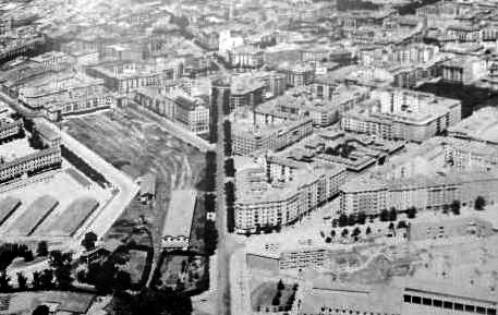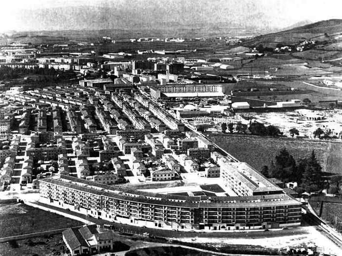 Esta entrada de la serie Pamplona a vista de pájaro no dispone de una solo foto principal aérea y panorámica sino de una colección de fotos, la mayoría de las cuales retratan el Ensanche en el año 1958. Para su mejor estudio empezaré por esas primeras fotografías de ese año que agruparé en esta primera parte de la entrada. En la primera foto que encabeza la entrada vemos un primer plano aéreo de la plaza Príncipe de Viana, que nos puede servir como referente visual. En el extremo superior izquierdo de la foto vemos los inconfundibles pabellones militares que colmatan esa parte del centro urbano. En la parte superior de la foto se atisba el Paseo de Sarasate, con la Casa Navasal todavía en pie y debajo del Paseo se puede ver el viejo edificio de la Casa de Baños. A su izquierda se divisa también el caserón municipal donde se alojaban las antiguas escuelas de Música y de Artes y Oficios. En la siguiente foto, que comparte parte del contenido con la anterior, podemos contemplar además la parte del Ensanche existente a la derecha de la Avenida de San Ignacio. Aun no se ha construido en la calle Cortes de Navarra el edificio residencia de los Padres Redentoristas, titulares de la cercana basílica. En el borde derecho de la foto se divisan los viejos chalets existentes en la confluencia entre la Avenida de Roncesvalles y Carlos III, donde 20 años más tarde se construiría el edificio central de la Caja de Ahorros de Navarra y que vemos con mucho más nivel de detalle en la foto inferior. En esta última instántanea de esta primera entrega fotográfica se observa, en la parte inferior, la torre y demás instalaciones del nuevo Parque de Bomberos de Pamplona, trasladadas, este mismo año, desde su vieja sede de la calle Eslava así como a su derecha el tejado del relativamente recién construido, -se había erigido seis años antes-, Frontón Labrit. El edificio del Servicio Doméstico en la calle Amaya aún no había realizado sus obras de ampliación en altura.