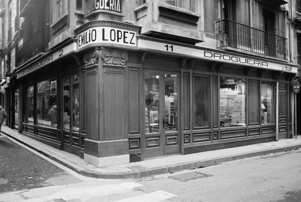 Droguería López había sido fundada en 1904 como botica bajo la dirección de Álvaro López Gómez, en el número 3 de la calle San Miguel, frente a su ubicación actual. Desde sus primeros años, el establecimiento se caracterizó por una oferta diversificada que, además de los productos propios de botica y droguería, incluía la venta de aparatos fotográficos. A finales de la década de 1920, Álvaro fue sustituido al frente del negocio por su hermano Emilio López, que continuó con la actividad hasta su fallecimiento. En ese mismo periodo, concretamente a finales de 1929, el establecimiento se trasladó a su emplazamiento definitivo, en el número 2 de la calle San Miguel, en el lado derecho de la vía, compartiendo numeración con la tienda de Ramón Yárnoz, dedicada a chocolates, azúcares y ceras. Esta mudanza consolidó la imagen de Droguería López en la esquina de San Miguel, donde permanecería hasta su cierre. El proyecto de fachada que ha llegado hasta nuestros días data de diciembre de 1928.