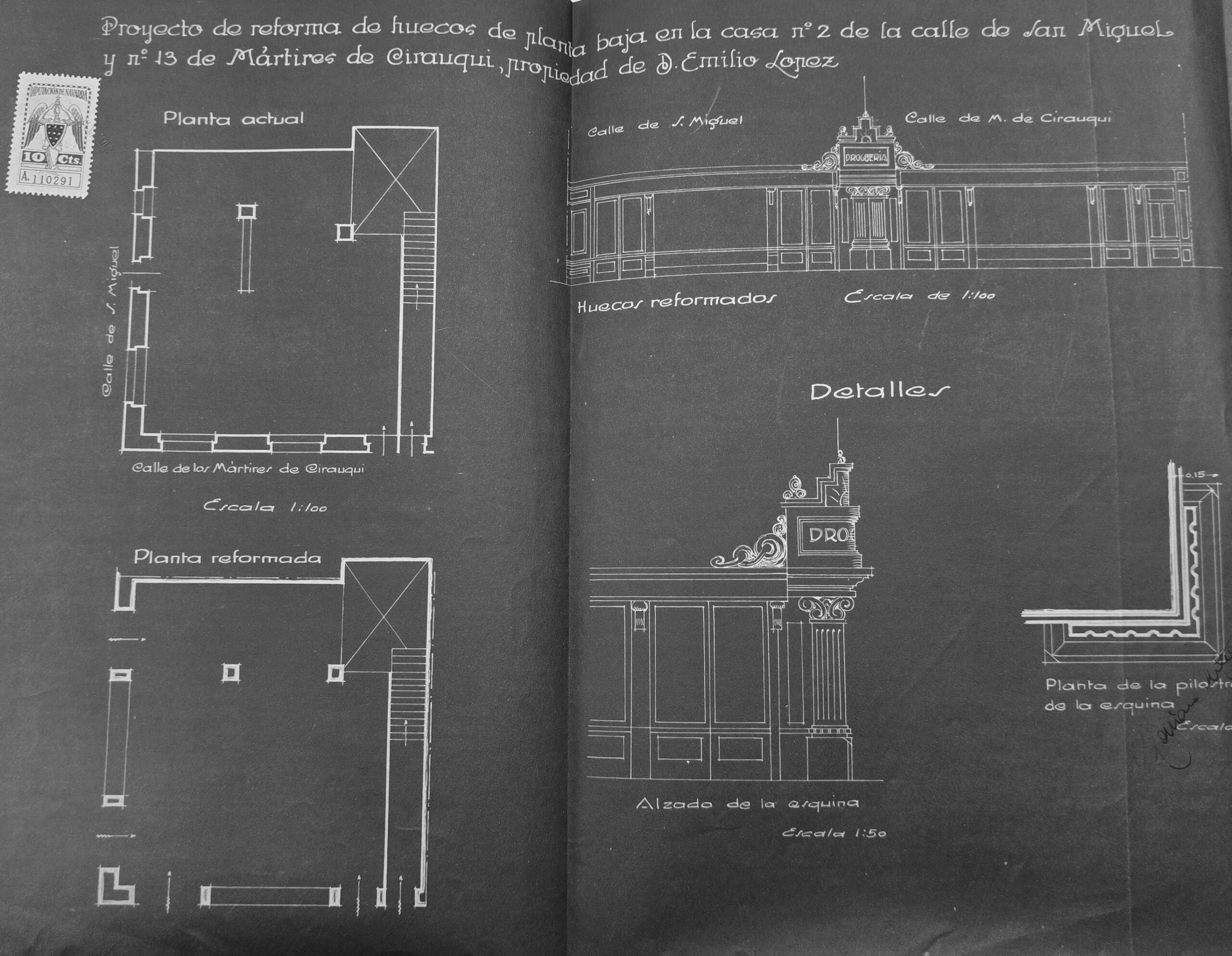 Fotos por orden de aparición: Nº 1: Exterior de la Droguería López. 2004. Javier Muru. Archivo Asociación Casco Antiguo de Pamplona. Nº 2: Proyecto de fachada de Droguería López. Diciembre 1928. Archivo Municipal de Pamplona. Nº 3: Interior de la Droguería López. 2004. Javier Muru. Archivo Asociación Casco Antiguo de Pamplona.